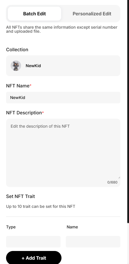 Edit the relevant information of the NFTs, including the name, description, and attributes (you can edit them in bulk or individually for customization).