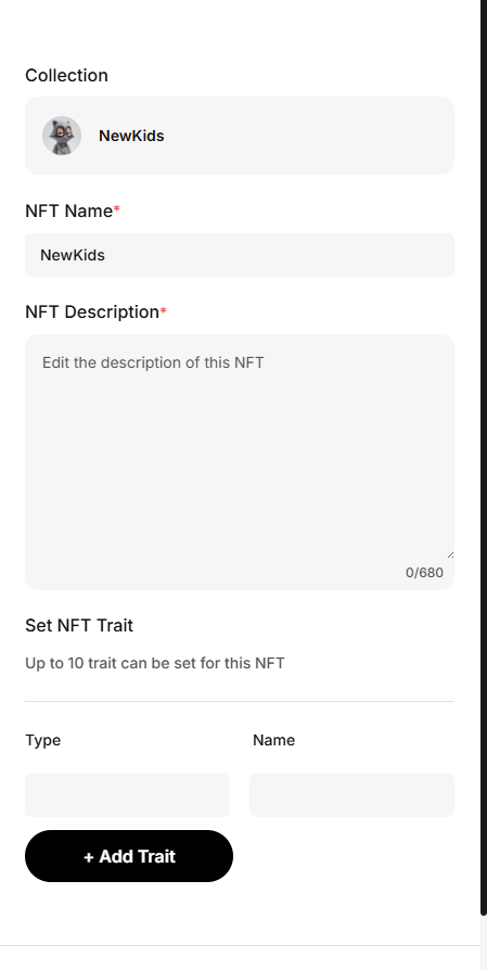 Edit the relevant information of the NFT, including the name, description, and attributes.