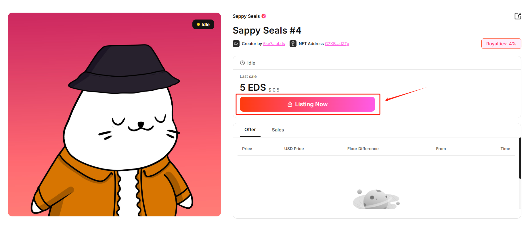 Go to the NFT details page and click “Listing Now.” Set the price you want to sell it for and the expiration time.